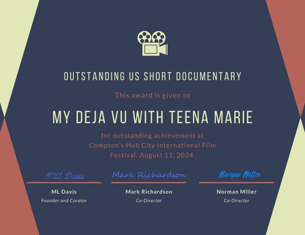 The short film audience award winner at the 2024 Compton International Film Festival and Marina Del Rey Film Festival, My Déjà vu With TEENA MARIE, will have its feature length World Premiere on August 8, 2025 at the Las Vegas Premiere Film Festival.